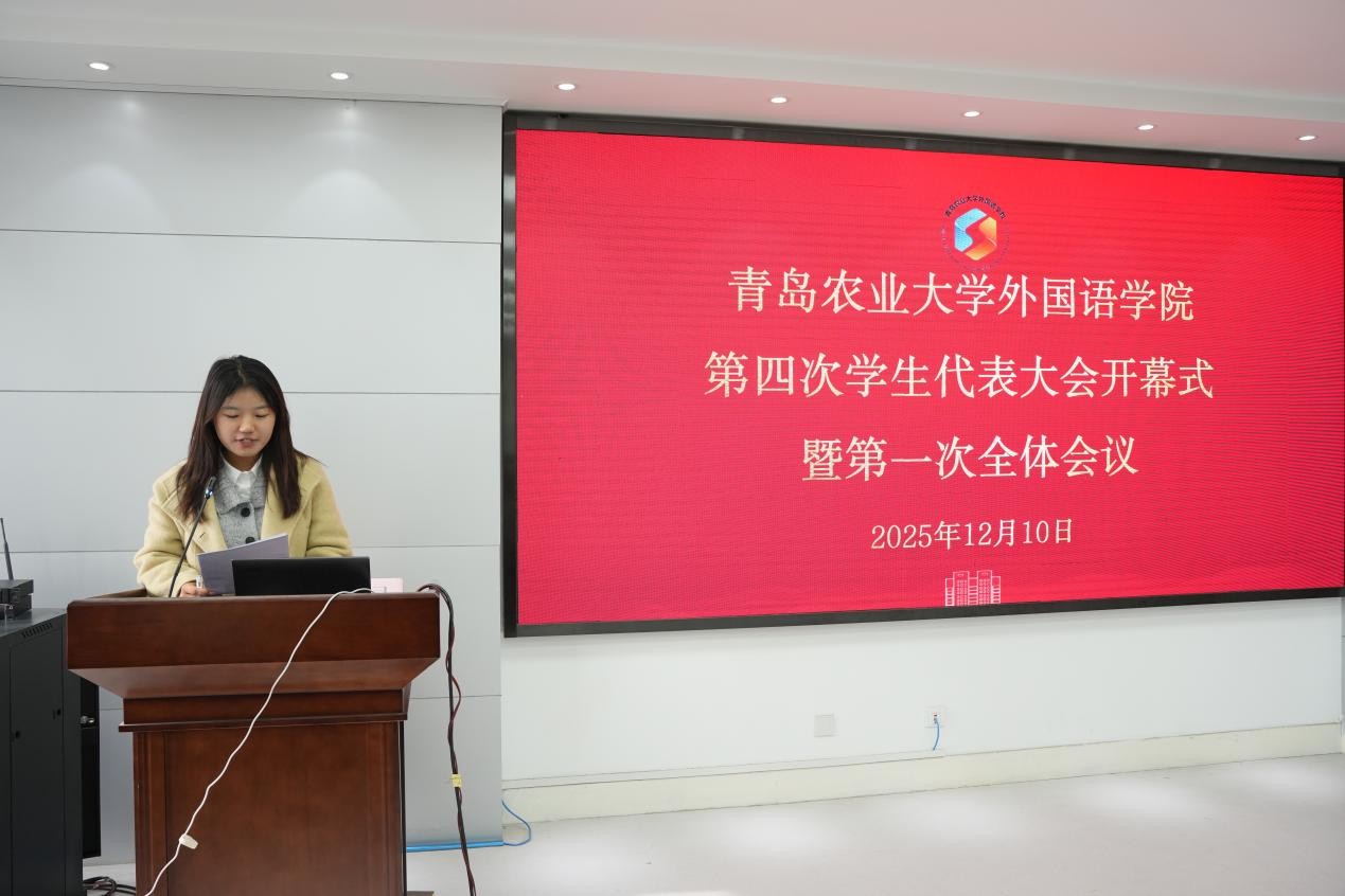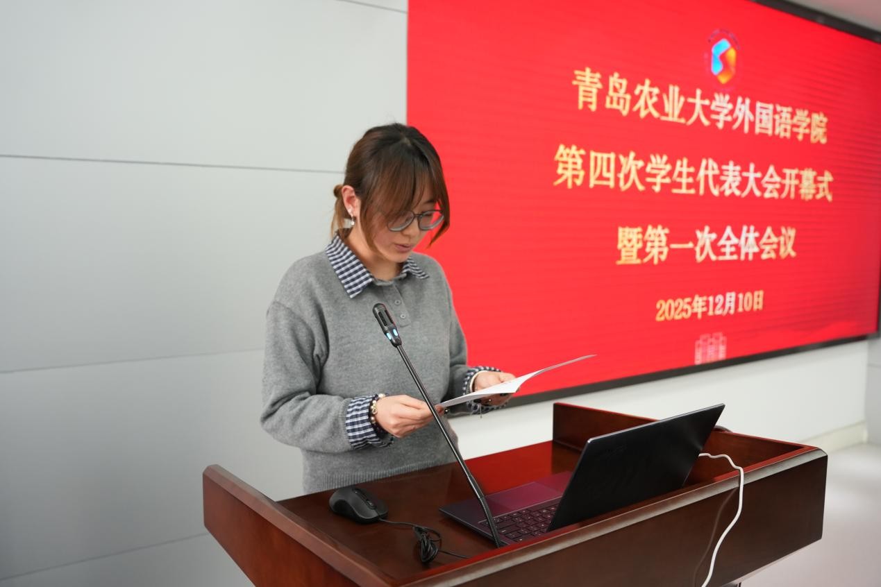 2025届学生会主席团成员于爽宣读了《关于同意召开青岛农业大学完美网页版页面第四次学生代表大会的批复》。学生会主席团成员张溪芮代表青岛农业大学完美网页版页面第三届学生会作工作报告,全面总结了学院学生会在过去一年的各项工作及取得的成绩,指出不足,并表示新一届成员将传承作风、弥补短板,扎实推进服务同学与学院发展工作。
