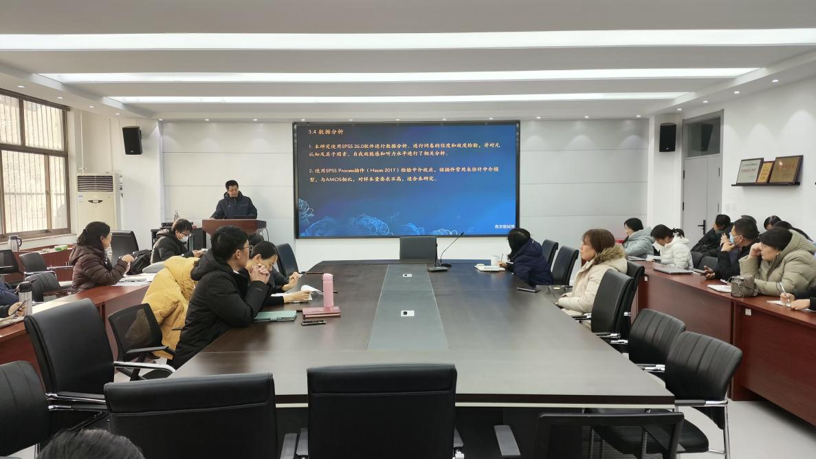 鲁华山副教授以“英语学习者元认知意识与二语听力成绩的关系:自我效能感的中介作用”为题作了学术报告。报告阐述了二语听力理解的影响因素及机制,并重点探讨了元认知意识、自我效能感和二语听力成绩之间的复杂关系。研究招募134名大学英语学习者作为研究对象,发现自我效能感在元认知意识和二语听力成绩之间起到了显著的中介作用。自我效能感较高的学习者更倾向于运用元认知意识来调节听力过程,从而提高二语听力理解水平。该研究不仅揭示了自我效能感对学业成绩的积极影响,还为教师在听力教学过程中如何培养学生的自我效能感和元认知意识提供了理论依据和实践参考。